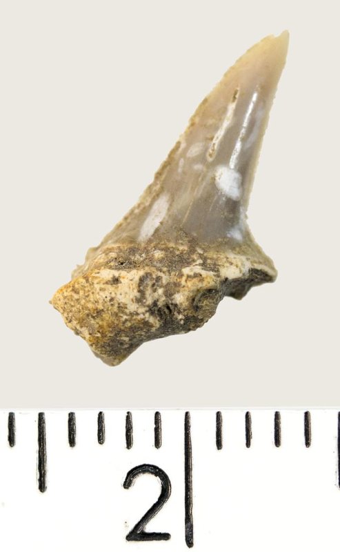 Зуб (фрагмент). Акула. Hypotodus sp. Классификация: Хордовые Chordata, Позвоночные Vertebrata, Хрящевые рыбы Chondrichthyes, Пластиножаберные Elasmobranchii