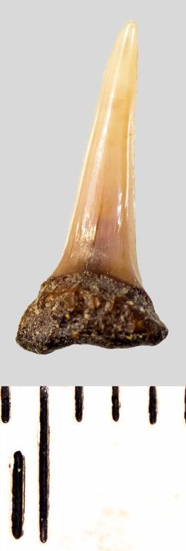 Зуб. Акула. Eostriatolamia subulata (Agassiz, 1843). Классификация: Хордовые Chordata, Позвоночные Vertebrata, Хрящевые рыбы Chondrichthyes, Пластиножаберные Elasmobranchii, Акулы Selachii, Ламнообразные Lamniformes, Песчаные акулы Odontaspididae