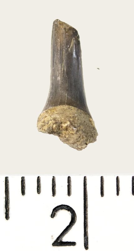 Зуб (фрагмент). Акула. Hypotodus sp. Классификация: Хордовые Chordata, Позвоночные Vertebrata, Хрящевые рыбы Chondrichthyes, Пластиножаберные Elasmobranchii