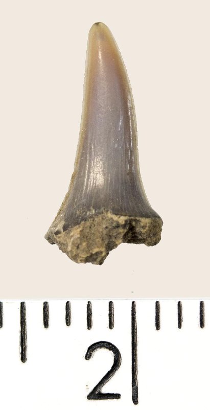 Зуб (фрагмент). Акула. Hypotodus sp. Классификация: Хордовые Chordata, Позвоночные Vertebrata, Хрящевые рыбы Chondrichthyes, Пластиножаберные Elasmobranchii