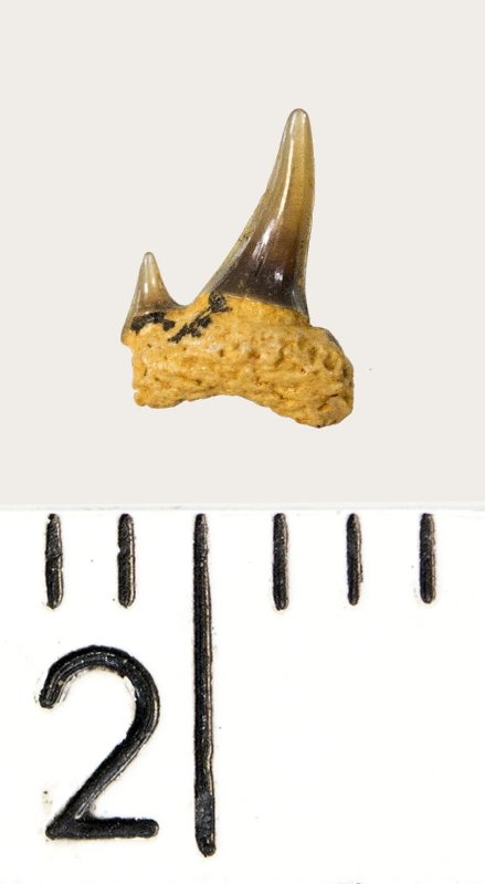 Мелкий задний зуб коричневого цвета с коронкой колющего типа, с гладким режущим краем, без скульптуры. Корень светло-охристый, арочный. Имелась одна пара боковых зубцов, сохранился левый.