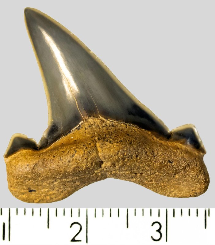 Крупный задне-боковой зуб с коронкой темно-серого цвета, режущего типа, без скульптуры, с гладким режущим краем. Корень серовато-охристый, арочный, умеренно массивный, с широкими, округлыми ветвями. Имеется одно питательное отверстие с лингвальной стороны корня. Присутствует пара широких режущих добавочных зубцов коронки.
