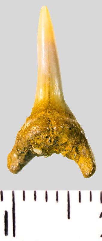 Передний зуб сливочного цвета с высокой, узкой коронкой колюще-режущего типа. Коронка S-образно изогнута, с гладким режущим краем. С лингвальной стороны у основания коронки на эмали имеется скульптура в виде слабой продольной струйчатости. Корень охристый, арочный, умеренно массивный, со следами окатанности и остатками породы между ветвями. Имеется питательная щель. Боковые зубцы отсутствуют.