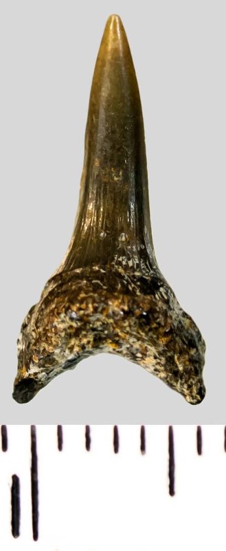 Передний зуб темно-коричневого цвета с высокой, узкой коронкой колюще-режущего типа. Коронка S-образно изогнута, с гладким режущим краем. С лингвальной стороны у основания коронки на эмали имеется скульптура в виде слабой продольной струйчатости. Корень бурый, арочный, умеренно массивный, со следами окатанности. Боковые зубцы отсутствуют.