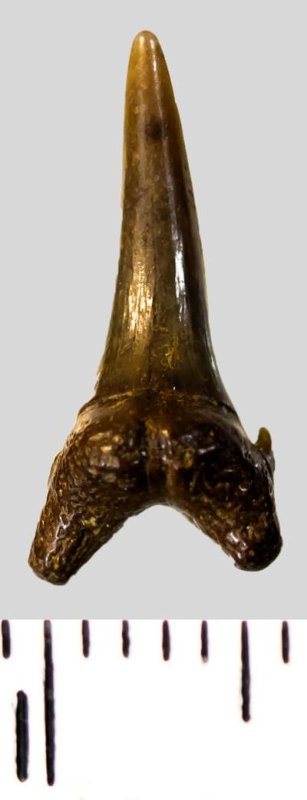 Передний зуб серо-коричневого цвета с высокой коронкой колюще-режущего типа. Коронка S-образно изогнута, с гладким режущим краем. С лингвальной стороны у основания коронки на эмали имеется скульптура в виде слабой продольной струйчатости. Корень бурый, арочный, умеренно массивный, со следами окатанности. Имеется питательная щель. Имелась одна пара боковых зубцов, сохранился правый.
