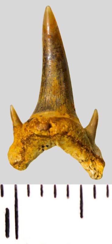 Передний зуб коричневого цвета с высокой коронкой колюще-режущего типа. Коронка S-образно изогнута, с гладким режущим краем. С лингвальной стороны у основания коронки на эмали имеется скульптура в виде слабой продольной струйчатости. Корень охристый, арочный, умеренно массивный, со следами окатанности. Имеется питательная щель. Имеется одна пара боковых зубцов.