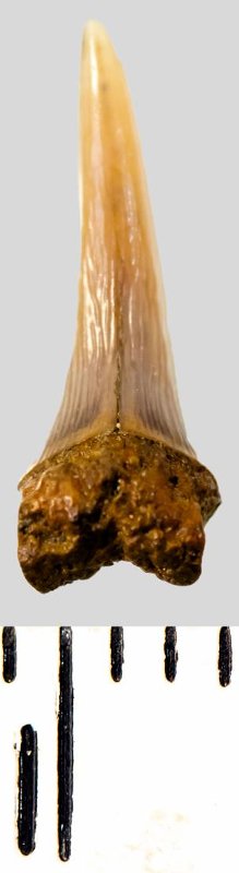 Зуб. Акула. Eostriatolamia subulata (Agassiz, 1843). Классификация: Хордовые Chordata, Позвоночные Vertebrata, Хрящевые рыбы Chondrichthyes, Пластиножаберные Elasmobranchii, Акулы Selachii, Ламнообразные Lamniformes, Песчаные акулы Odontaspididae