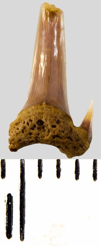 Зуб. Акула. Eostriatolamia subulata (Agassiz, 1843). Классификация: Хордовые Chordata, Позвоночные Vertebrata, Хрящевые рыбы Chondrichthyes, Пластиножаберные Elasmobranchii, Акулы Selachii, Ламнообразные Lamniformes, Песчаные акулы Odontaspididae