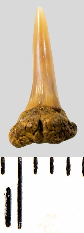 Зуб. Акула. Eostriatolamia subulata (Agassiz, 1843). Классификация: Хордовые Chordata, Позвоночные Vertebrata, Хрящевые рыбы Chondrichthyes, Пластиножаберные Elasmobranchii, Акулы Selachii, Ламнообразные Lamniformes, Песчаные акулы Odontaspididae