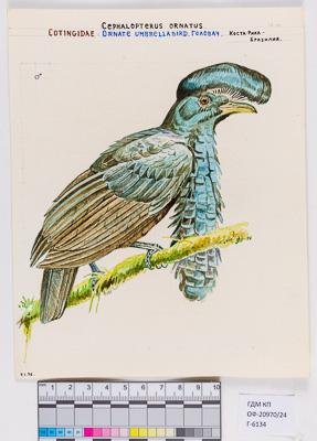Амазонская зонтичная птица, или амазонский головач. Cephalopterus ornatus. Рисунок