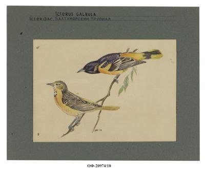 Балтиморский цветной трупиал, самец и самка. Icterus galbula. Рисунок