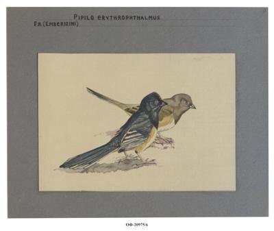 Красноглазый тауи, самец и самка. Pipilo erythrophthalmus. Рисунок