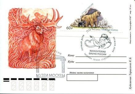 На открытке слева изображен красный большерогий олень (Художник – Тарасенко К.Б.), справа место для адреса. В верхнем правом углу марка с изображением пещерного медведя с детенышем и номиналом 60 руб. (Художник – Салтыкова А.-М. Оформление – Савина О.). Животное подписано на русском и дано латинское название. На конверте штампа гашения с изображением головы мамонта (Художник – Егиазарян А.) и штамп гашения музеев Москвы.