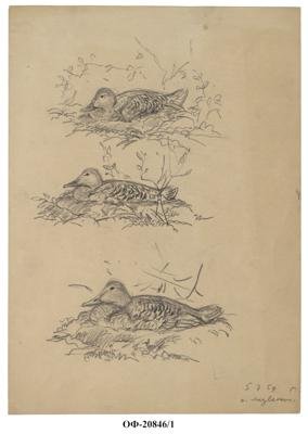 Гага на гнезде. Три зарисовки. Остров Медвежий. Рисунок