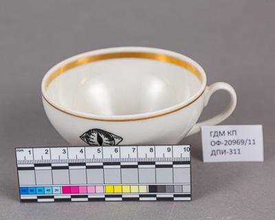 Белого цвета. Тулово расширяющееся кверху, ручка С-образной формы. На одном боку черная деколь в виде стеклянного глаза с горизонтальным овальным зрачком; на противоположном боку - глаз с вертикальным ромбовидным зрачком. Край внутренней поверхности с широкой золотой отводкой, снаружи - тонкой золотой отводкой.