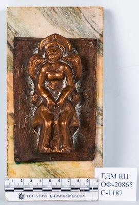 Бронзовый рельеф, закрепленный на прямоугольной каменной пластине, на оборотной стороне которой - металлическая петля для подвешивания. Из прямоугольной бронзовой пластины рельефно выступает женская фигура в полный рост, руки сложены на бедрах впереди, колени полусогнуты. За спиной видны сложенные крылья, над головой - двойной нимб.