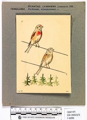 Коноплянка, или реполов - самец и самка. Acanthis cannabina. Рисунок
