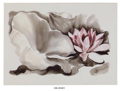 На открытке горизонтального формата на белом фоне гризайль с изображениями листьев водяной лилии, слева розовый цветок лилии.