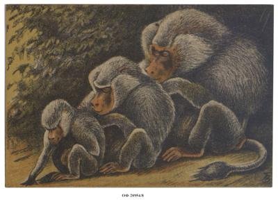Открытка горизонтального формата. На фоне растительности друг за другом сидят три гамадрила, маленький, за ним побольше, сзади самый большой. На обороте место для адреса и для сообщения.