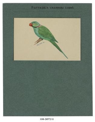 Индийский кольчатый попугай, или ожереловый попугай Крамера. Psittacula krameri. Рисунок