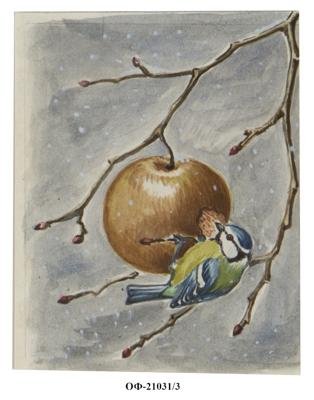 Синица-лазоревка на замерзшем яблоке, Рисунок