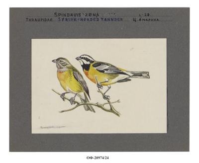 Кубинская зена, или багамская танагра. Spindalis zena. Самец и самка. Рисунок