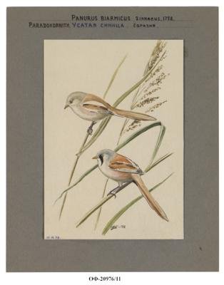 Усатые синицы, самка и самец. Panurus biarmicus. Рисунок
