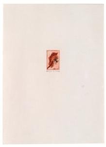Почти в центре листа вертикального формата выполнен миниатюрный отпечаток в красных тонах с изображением цветка цикламена и черной мухи, сидящей на его лепестке.
