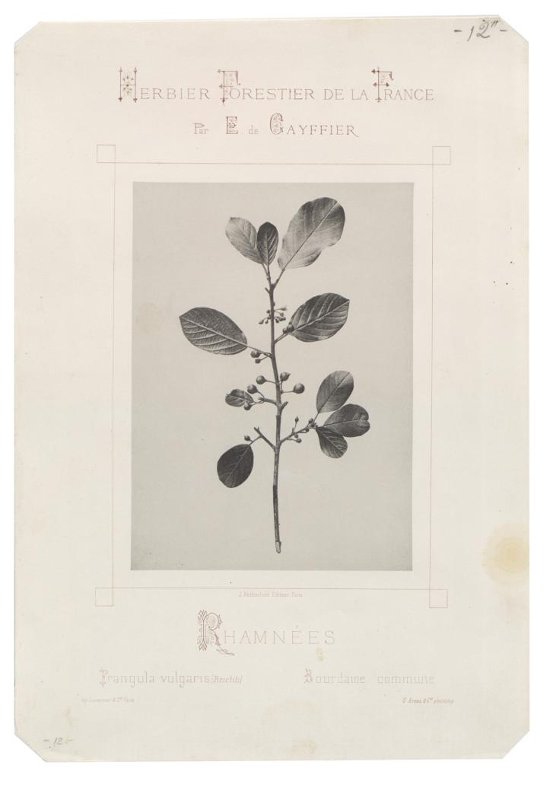 На листе вертикального формата в тонкой рамке фотографическое изображение ветки крушины. Под изображением название на латинском и французском языках.