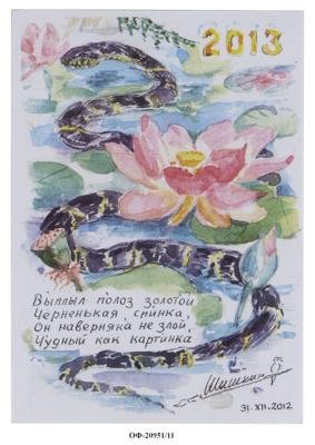На листе вертикального формата среди розовых водяных лилий извивается черно-желтый полоз. Вверху желтым: 2013.