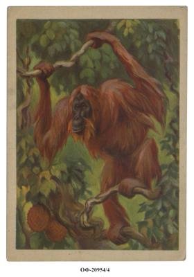 Открытка вертикального формата с белыми полями. На фоне тропической растительности крупно изображен оранг в ветвях, внизу слева два крупных плода. На обороте место для адреса и для сообщения. Вверху логотип «ГИЗ».