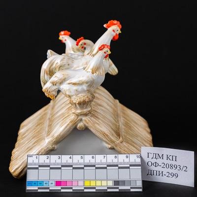 Крышка шкатулки в виде соломенной двускатной крыши собачьей будки, на коньке которой сидят 3 курицы и петух.