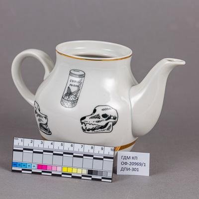 Тулово белого цвета с покатыми плечиками и "с"- образной ручкой. На боках чайника черная деколь: череп собаки, муляж головы собаки с приоткрытой пастью, а посередине - баночка-морилка с бабочкой внутри и надписью:: «CYANIDE POISON». Низ тулова окаймлен широкой золотой полоской, по горловине идет тонкая золотая полоска.