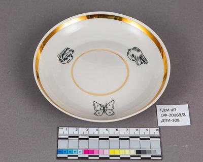 Круглой формы со слегка приподнятыми бортами. По борту деколь из 3 фрагментов: изображение черепа собаки; муляжа головы собаки и расправленной между булавок бабочки. По краю борта широкая золотая отводка, вокруг центра блюдца - тонкая.