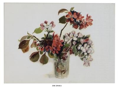 На открытке горизонтального формата натюрморт с цветущими ветками яблони в прозрачном стакане на белом фоне.