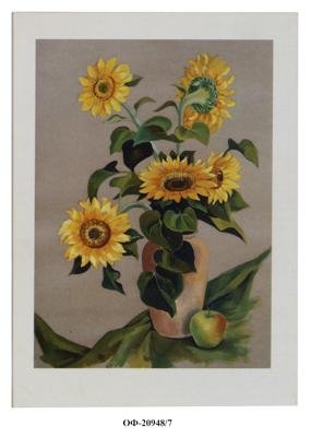 На открытке вертикального формата на сером фоне изображены пять цветков подсолнуха в глиняной вазе, рядом лежит яблоко.