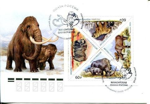 Конверт первого дня гашения с изображением мамонта с мамонтенком в пейзаже (Художник – Карпова Н.). Квадратный квартблок состоит из четырёх треугольных марок номиналом 60 рублей (Художник – Салтыкова А.-М. Оформление – Савина О.). На каждой марке изображен представитель мамонтовой фауны в пейзаже: пещерный медведь и шерстистый носорог с детёнышами; лось и овцебык. Животные подписаны на русском и даны латинские названия. На конверте два штампа гашения с изображением головы мамонта (Художник – Егиазарян А.).