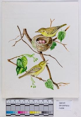 Зелёные пересмешки у гнезда с яйцами. Hippolais icterina. Рисунок