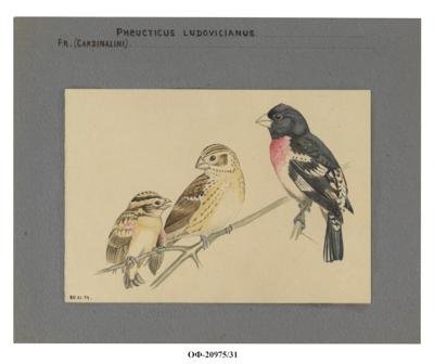 Красногрудый дубоносовый кардинал. Pheucticus ludovicianus. Молодая птица, самка и самец. Рисунок