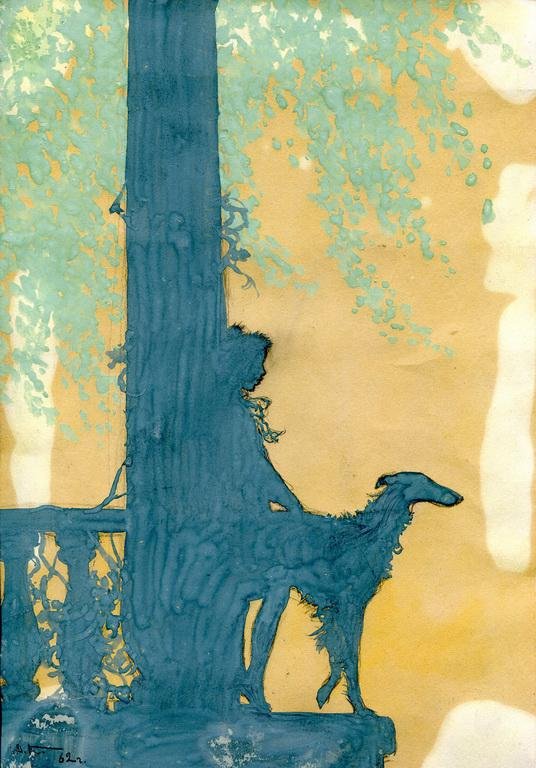 На балконе, прижавшись к колонне, стоит девушка с борзой собакой. Профильное силуэтное изображение балкона, девушки, борзой и ствола дерева голубовато-серого цвета. Листва - бледно-зелёного цвета.
