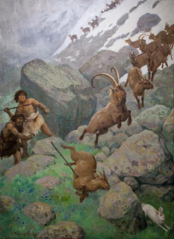 Охота человека древне-каменного века в альпийской зоне. Картина