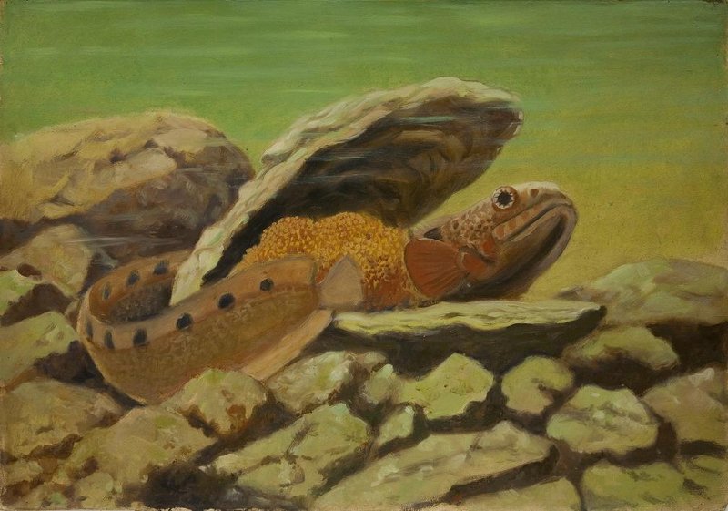Маслюк с раковиной и икрой (охраняет свою икру). Картина