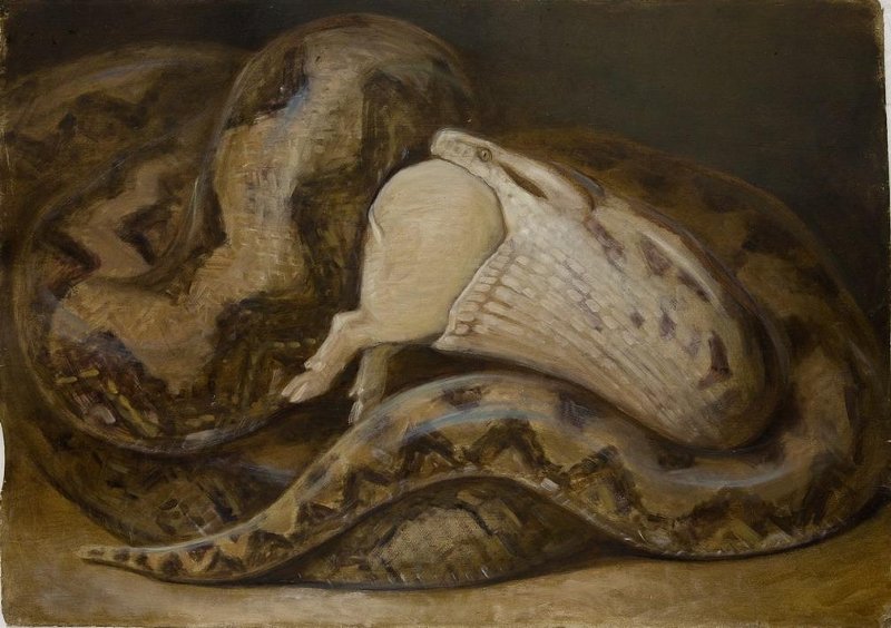 На картоне горизонтального формата, на тёплом сером фоне, изображен сложившийся кольцами удав. В центре крупно показана его голова с широко открытым ртом, из которого торчит часть туловища поросёнка с задними ногами. Окрас поросёнка розовато-белый. На первом плане хвост удава. Слева от головы часть туловища удава расположилась вертикально.