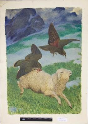 На прямоугольном картоне горизонтального формата в гористом пейзаже изображено нападение двух попугаев кеа (нестор) на овцу. Овца бежит с запрокинутой вверх головой, у неё на спине сидит попугай и клюёт её. Второй попугай летит в отдалении.