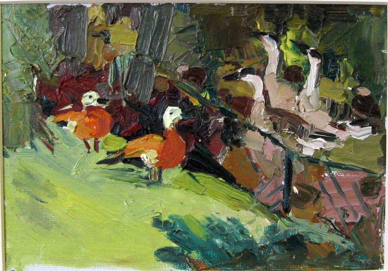 На картине горизонтального формата изображен уголок зоопарка, где по разные стороны от невысокого заборчика, разделяющего разные вольеры, гуляют две красные утки (огари) и три сухоноса, или китайских гуся. Основная колористическая гамма произведения теплая. Слева на желто-зеленой траве возле темно-зеленой оградки гуляют две красные утки. У них оранжево-коричневое оперение, белые головы и белые полосы на крыльях, черные маховые перья, черные клювы. Справа за заборчиком стоят три гуся, вытянув шеи и подняв головы, они смотрят налево, в сторону уток. У гусей верхняя часть головы и задняя сторона шеи темно-коричневые, клювы черные со светлой каймой у основания, шея спереди, грудь и живот кремовые, спины и бока коричневые, маховые перья черные. Задний план написан обобщенно, широкими мазками светло-зеленого, оливкового, светло-охристого, лимонно-желтого и красно-коричневого цвета. Справа вдали вырисовывается силуэт коричневой утки с черной головой. Краски наложены очень густо, пастозно, фактура мазка хорошо видна. Холст в паспарту.