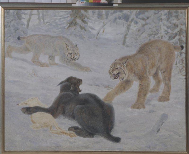 На картине горизонтального формата изображены три рыси в зимнем лесу. Основная колористическая гамма полотна холодная. На первом плане в центре на снегу лежит черная рысь. Под ее левой передней лапой на снегу лежит убитый желтовато-белый заяц. Черная рысь, прижав уши, повернула голову направо вглубь картины, пасть ее с острыми клыками широко раскрыта. Справа к ней подходит нормально окрашенная светлая рыжевато-палевая рысь. Ее уши также прижаты, пасть оскалена. Слева на втором плане крадется на полусогнутых ногах третья серебристо-палевая рысь. Ее морда также оскалена, взгляд направлен на черную рысь. Снег написан голубовато-серым. На втором плане виднеются заснеженные деревья. Краски наложены очень густо, пастозно, фактура мазка хорошо видна.