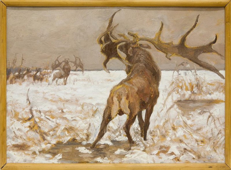 Композиция горизонтального формата. На первом плане справа изображен стоящий на берегу небольшого водоема сзади в повороте в три четверти направо самец большерогого оленя. Он стоит, повернув голову с огромными рогами налево, в глубину картины. Там в отдалении на заснеженном поле виден еще один самец большерогого оленя в сопровождении двух безрогих самок. За животными слева виден чахлый лес или кустарник. Небо серое, линия горизонта проходит чуть выше середины картины.