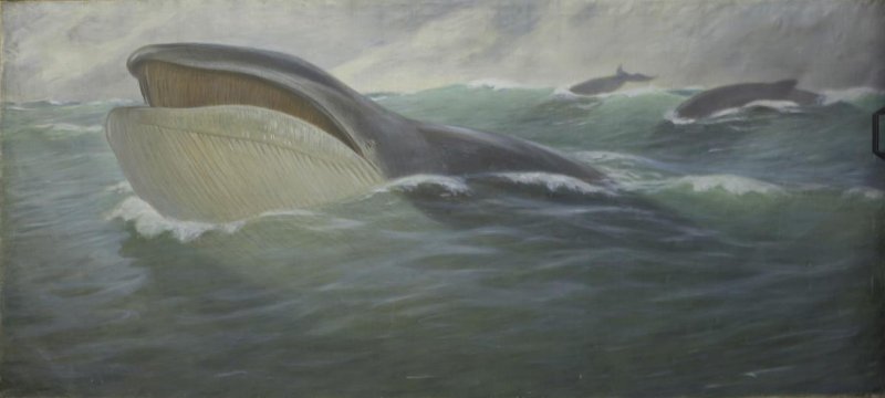 На картине горизонтального формата изображены три кита-полосатика, плывущие в открытом море. Основная колористическая гамма полотна холодная. Животные движутся справа налево вдоль картинной плоскости. На первом плане из воды, в окружении белой пены, выныривает большой кит. Над поверхностью воды видна его голова с приоткрытой пастью, в которой виднеется желтоватый китовый ус, и часть темно-серой спины. Нижняя челюсть и живот, покрытые продольными бороздами, белого цвета. Справа на втором плане видны еще два кита: у одного над водой поднимается хвост, у второго – темная спина с маленьким плавником. Волнующееся зеленовато-синее море вдали несколько светлеет. Небо над высоко расположенной линией горизонта затянуто серыми облаками. Краски наложены тонкими лессировочными слоями.