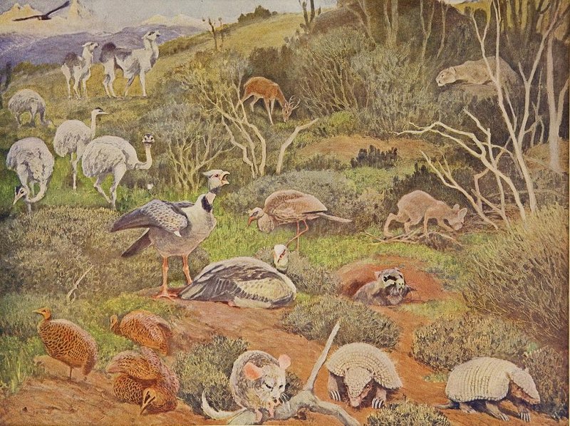 Иллюстрация фауны Патагонской подобласти. На картине горизонтального формата холмистый пейзаж со светло-зелёной травой и мелким серебристо-зелёным кустарником на первом плане и с горами на дальнем плане слева. На первом плане в центре на ветке сидит шиншилла, справа от неё два броненосца, слева три пестрые светло-коричневые птицы тинаму. Над шиншиллой и правее неё нора с вылезающей оттуда вискашей, за ней дальше уходящая вправо мара (патагонский заяц). В правом верхнем углу среди кустов и камней изображена пума в профиль влево, она охотится на пампасского оленя, пасущегося левее. Вверху справа изображены две идущие вправо ламы, над ними летит черный кондор. Из птиц представлены слева четыре нанду, правее на среднем плане две хохлатые паламеи или чахи, за ними птица похожая на журавля.