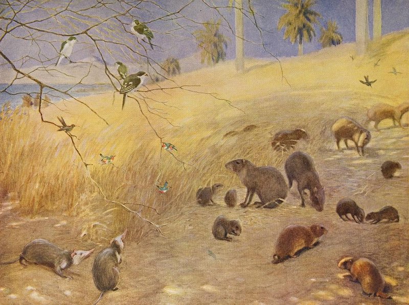 Иллюстрация фауны Антильской подобласти. На картине горизонтального формата изображен холмистый пейзаж с берегом, покрытом желтой травой, спускающемся к морю. На дальнем плане пологие горы. На первом плане слева сверху спускаются своеобразной кулисой тонкие ветви на которых сидят мелкие яркоокрашенные птички, птички тоди, колибри, трогоны. На дальнем плане светло-серые стройные стволы высоких деревьев. Слева на первом плане внизу изображены два насекомоядных животных, правее группа темно-коричневых грызунов – агути.